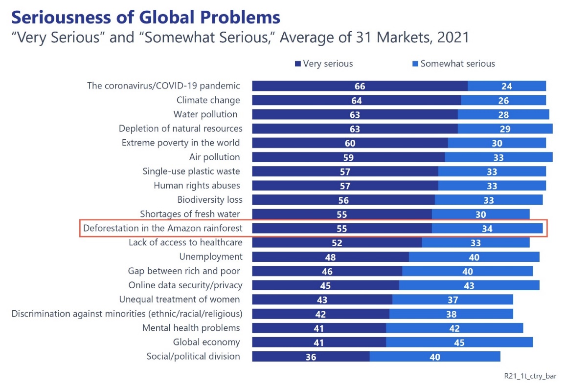 GlobeScan’s latest public opinion research shows that more than half of people across the world agree that deforestation of the Amazon rainforest is a very serious problem. People are more concerned about this than other world problems such as access to healthcare and unemployment.
