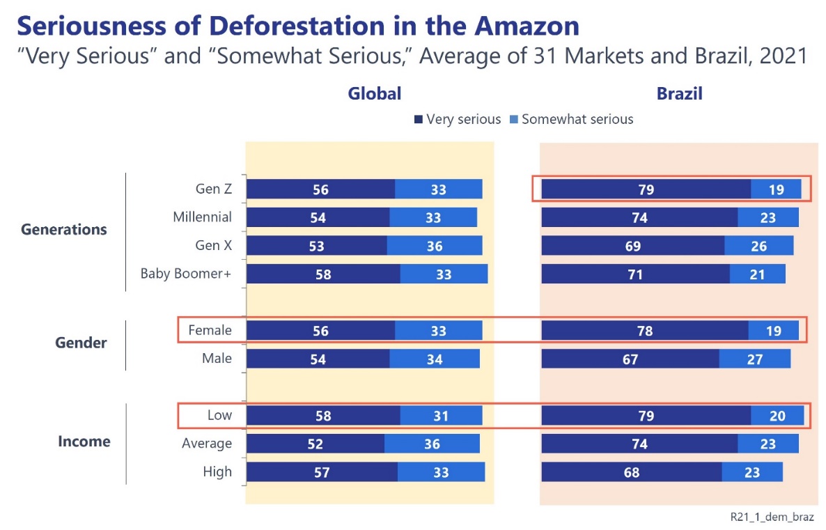 When looking at different demographics, younger generations, women, and low-income respondents are more worried about Amazon deforestation in Brazil. Globally, demographic differences are more muted.