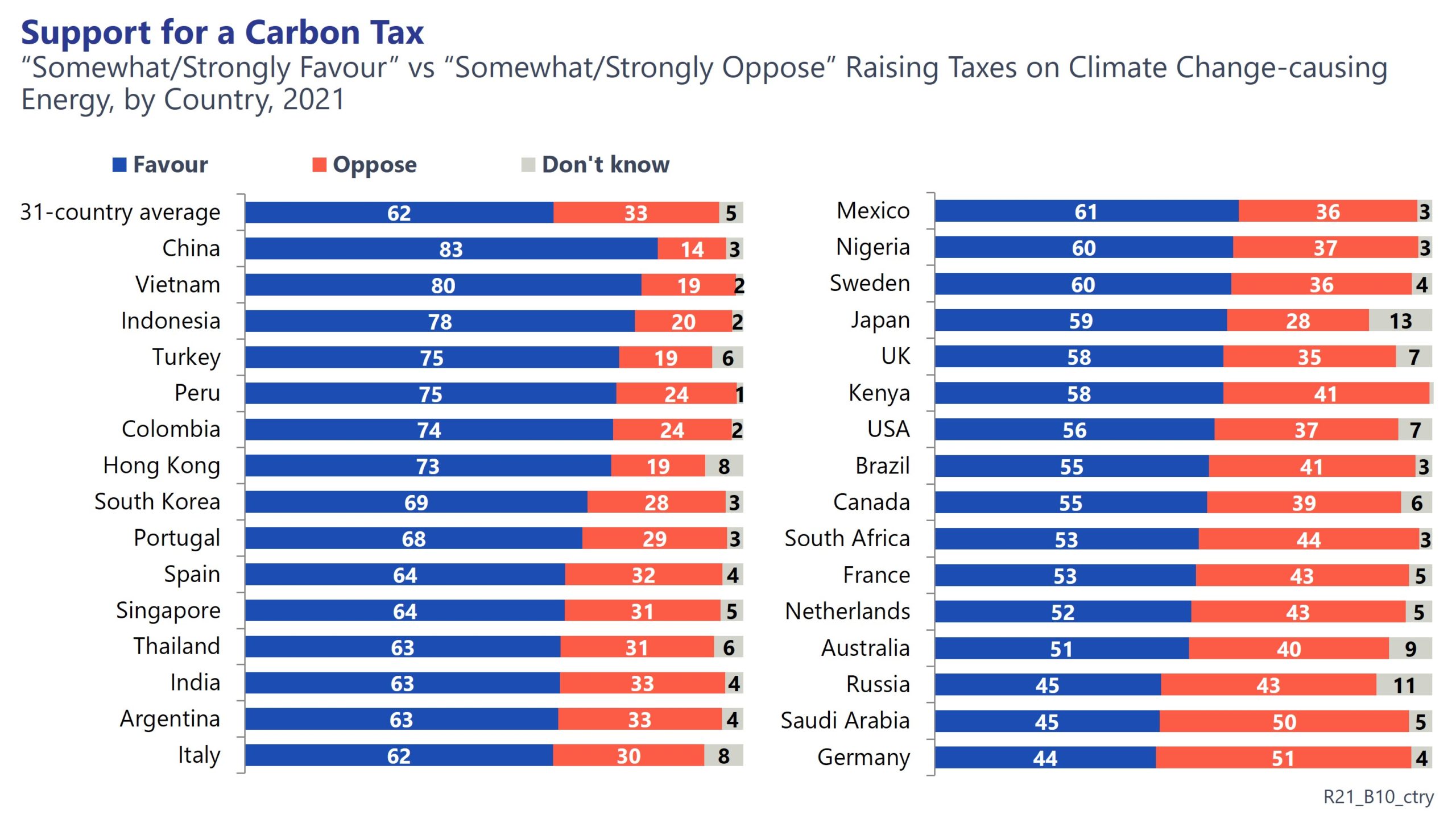 The poll of 31 countries and territories was conducted by GlobeScan in June and July 2021. In total, more than 30,000 people were surveyed about their attitudes toward addressing climate change through a carbon tax. Key findings include the following: