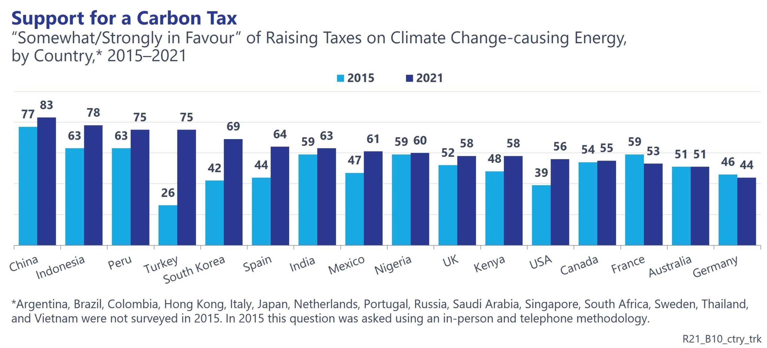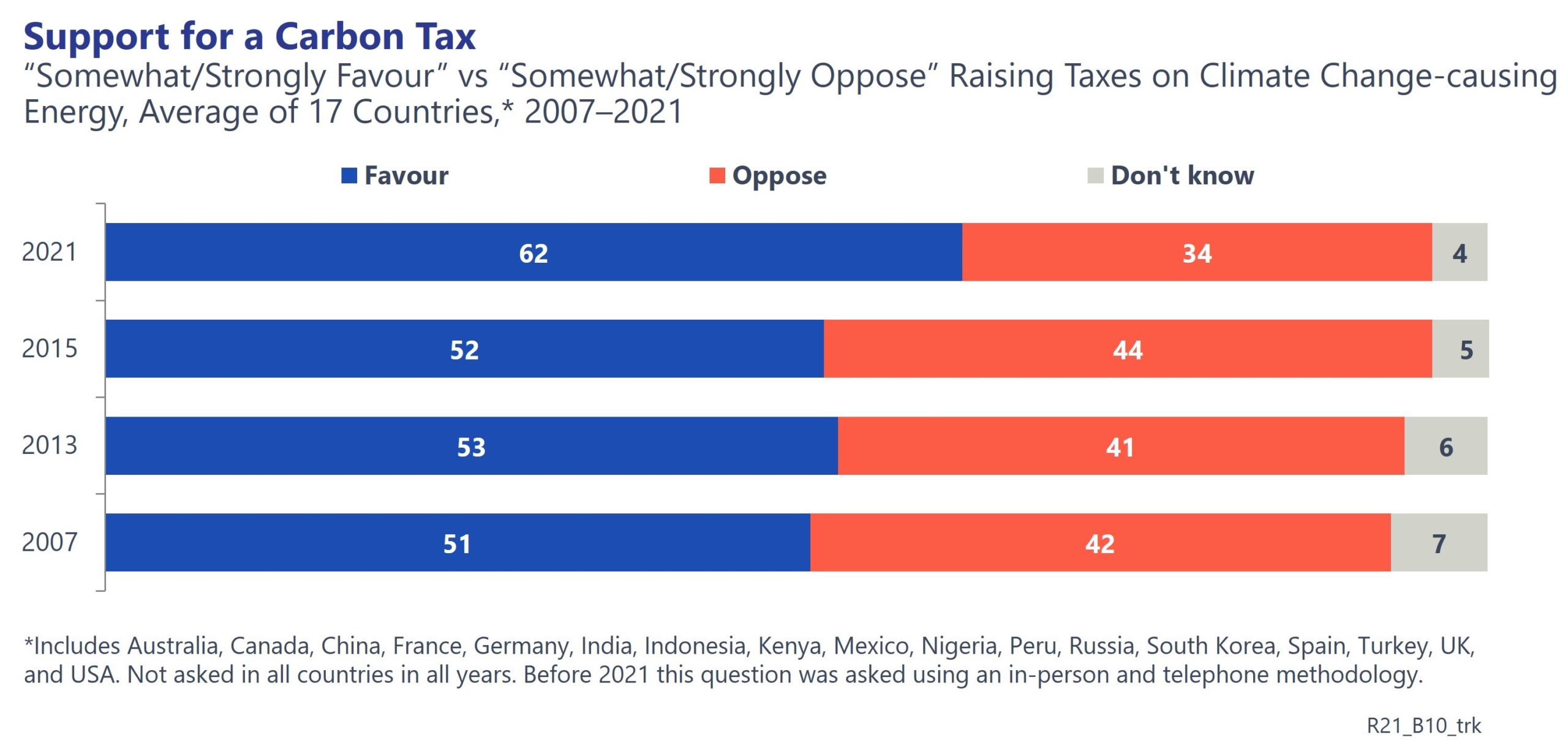 - Support for a carbon tax has increased from 52 percent in 2015 to 62 percent in 2021, after holding steady between 2007 and 2015, across the same 17 countries tracked since 2007.